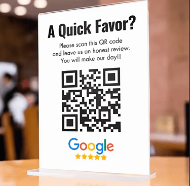 A sign with a QR code or optional Google Review "Tap" Cards or Stands